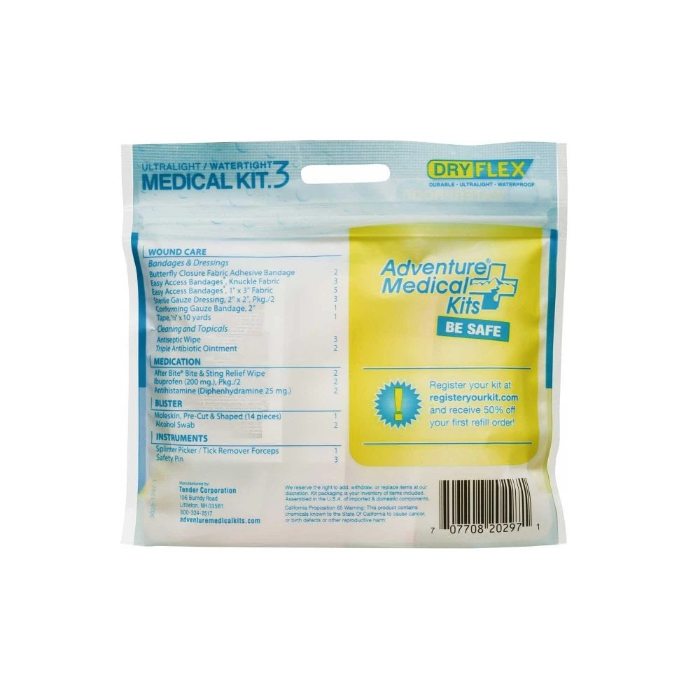 Adventure Medical Kits describe the Medical Kit 3 as: “The ultimate ultralight medical kit, the Ultralight/Watertight .3 contains the first aid essentials you need for solo day trips where portable, waterproof gear is a must. Ideal for multi-sport athletes, supplies come in a reusable, waterproof dry bag.