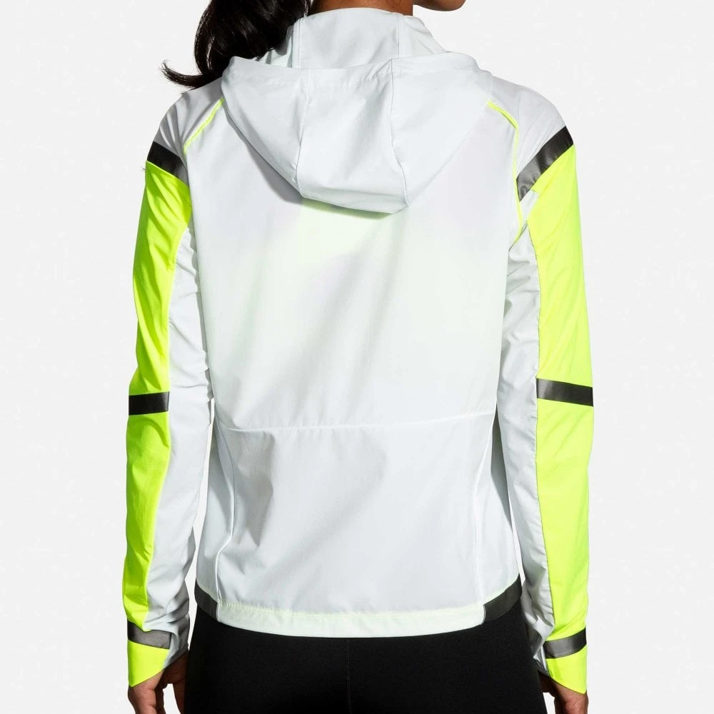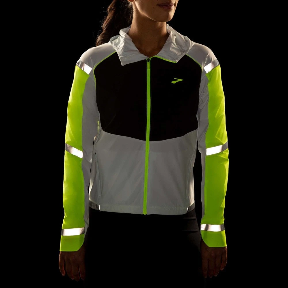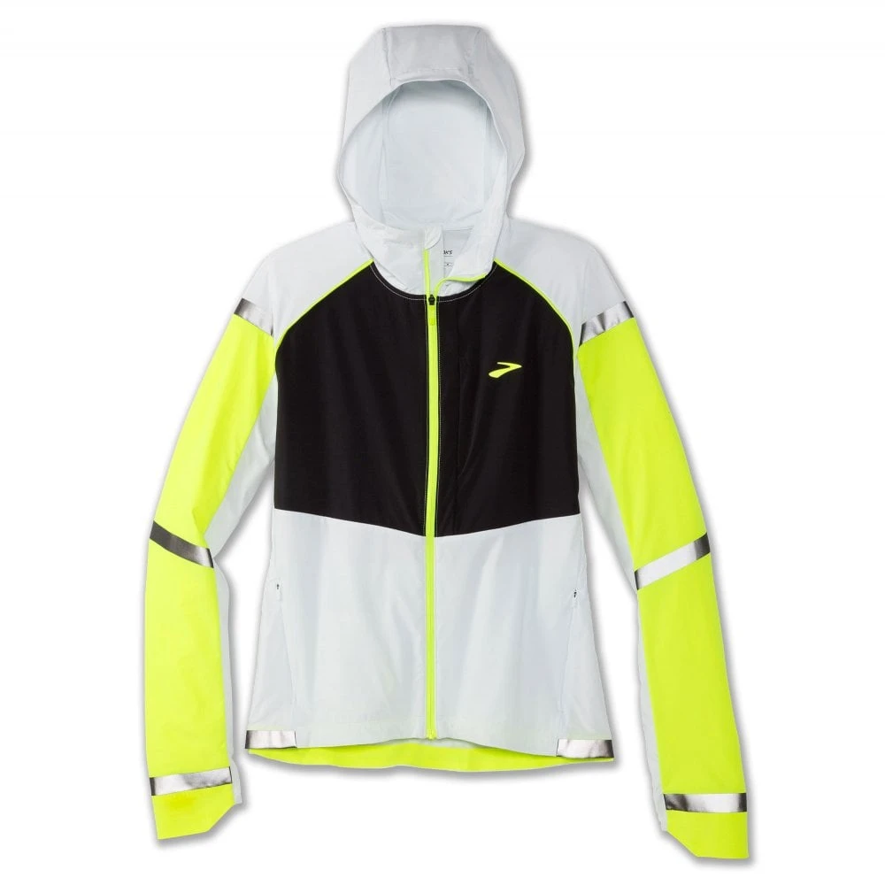 The Brooks Carbonite womens running jacket is a true all-rounder with wind and water protection, visibility in the dark to avoid accidents at night and comes semi-fitted, where the jacket follows your natural shape and leaves room to breath. It has a hood that packs away tight and secure.