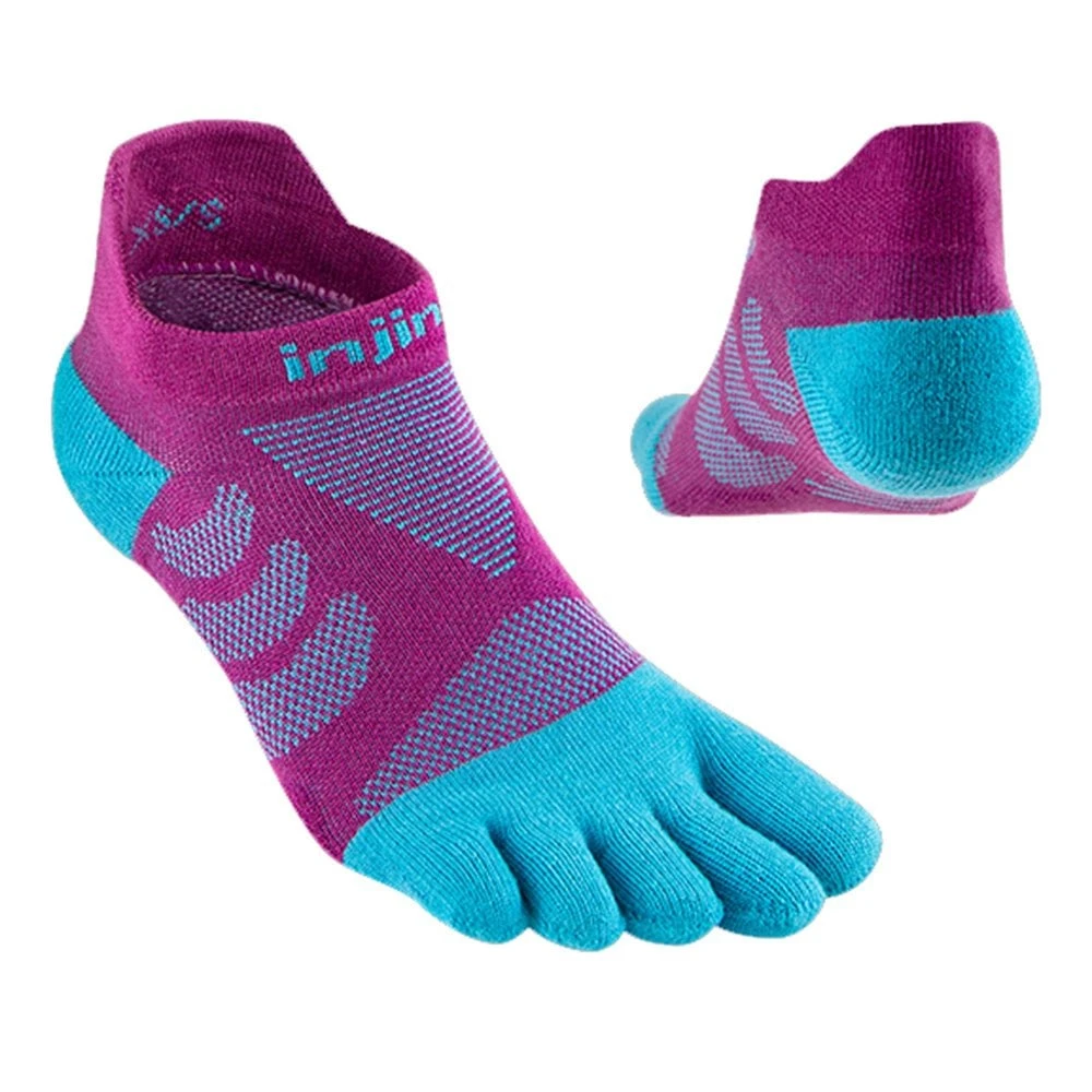 The injinji Womens Run Ultra No Show sock in Jam is designed to be super-cushioned through the foot and toes, and provide comfort and support even after very long distances.