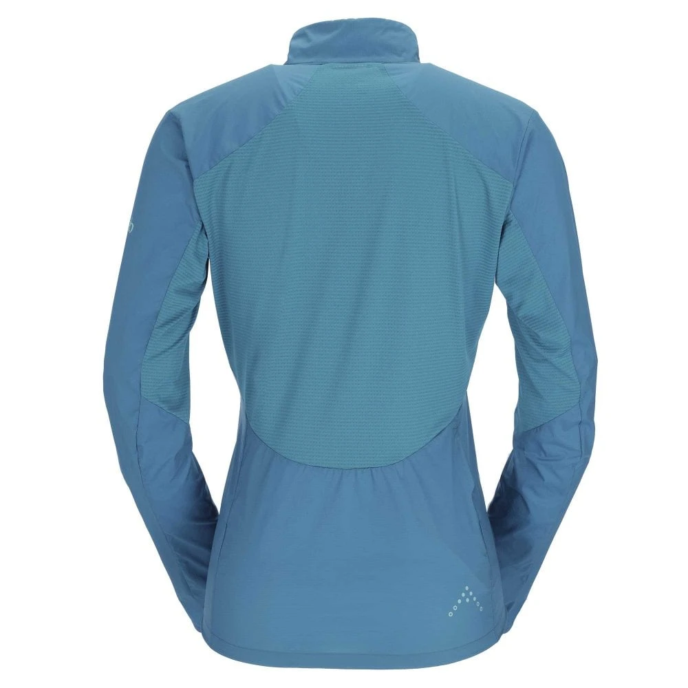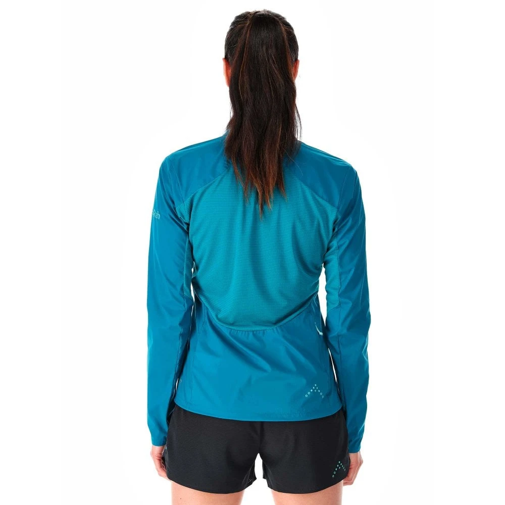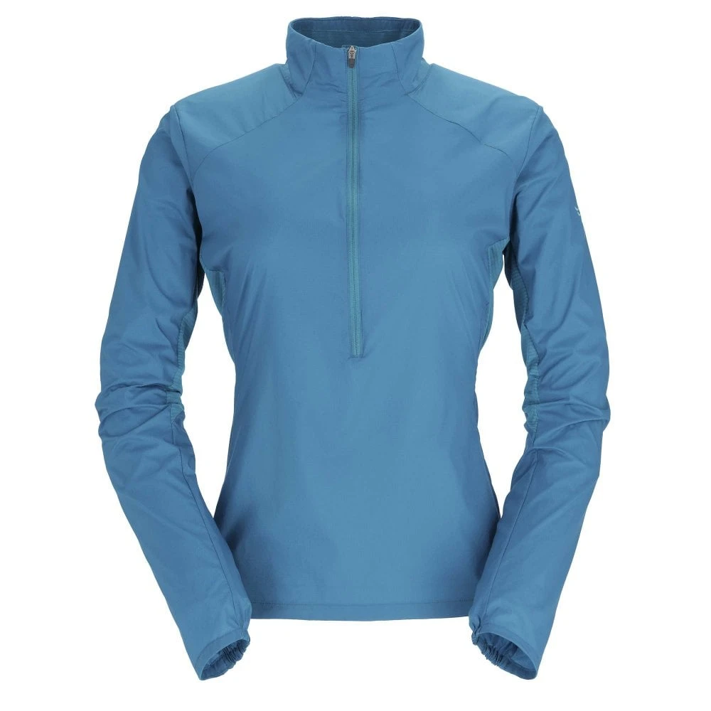 Rab describe the women’s Windveil windproof mid-layer as: “The Windveil Pull-On is built to offer windproof protection on mountain runs or fast hiking days. It combines wind resistant, breathable, and protective Pertex® Quantum Air with strategically placed panels of Motiv™ Aero mesh fabric. As you pick up the pace or face steep inclines, high heat areas enjoy enhanced breathability. Quick drying and fast wicking, it regulates your temperature without breaking your flow while offering protection from howling mountain wind.